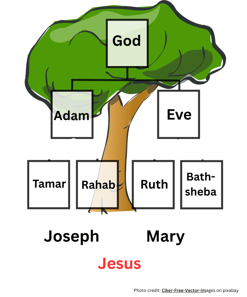 He doesn’t list the respectable matriarchs you’d expect – Sarah, Rebekah, Leah. Instead, he names Tamar, Rahab, Ruth, Bathsheba (referred to as “Uriah’s wife”), and Mary.